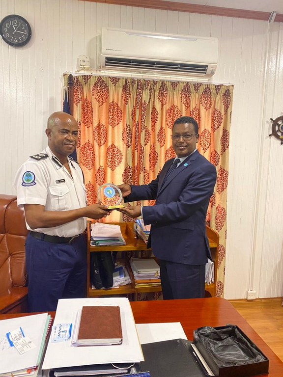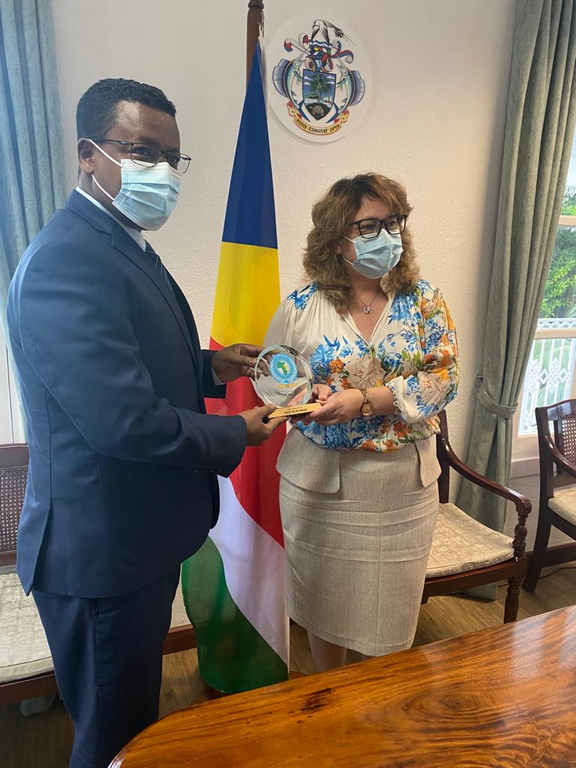 سجل المدير بعد حفل الافتتاح زيارة إلى رئيس الاركان العقيد ميكل مدير شرطة سيشل، والسيد تيد ووكيل وزارة الخارجية سعادة السفير فوك تاف.