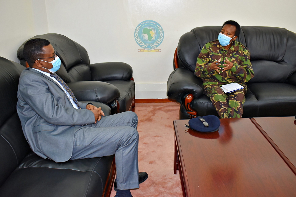 Le Directeur de l'EASF, le Brigadier Général Getachew Shiferaw Fayisa, a accueilli la nouvelle Directrice de l'International Peace Support Training Center (IPSTC), le Brigadier Joyce Sitienei, au Secrétariat de l'EASF à Karen, Nairobi, le 13 Août 2021.