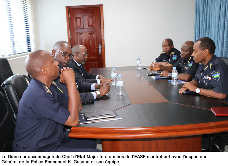 Au cours de la visite au siège de la police nationale du Rwanda, Dr Bouh a été reçu par l'Inspecteur Général de la Police (IGP), Emmanuel K. Gasana. Les deux dirigeants ont souligné le rôle important joué par l'Ecole de Formation de la Police à Gishari, au Rwanda. Jusqu'à présent, l'école offrait de nombreuses formations à des centaines de policiers de nombreux pays à travers le soutien de différentes entités dont l'EASF. M. Bouh a soutenu qu'une meilleure coopération et un renforcement des capacités améliorés, auront un impact direct sur l'efficacité des forces de maintien de la paix, assurant ainsi le maintien de la paix dans la région et au-delà.