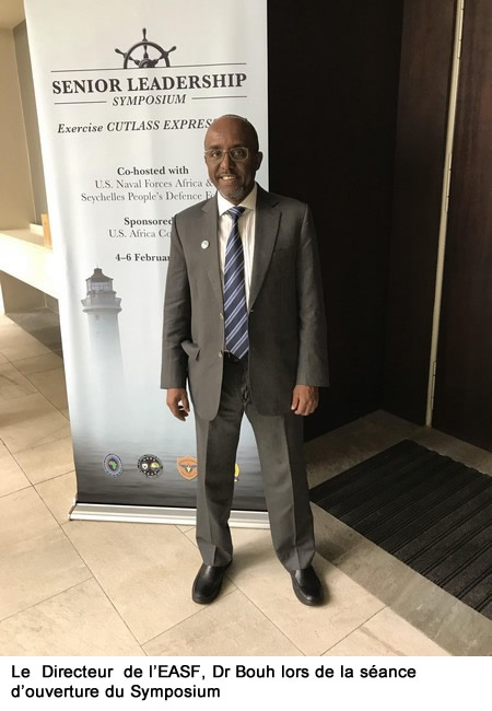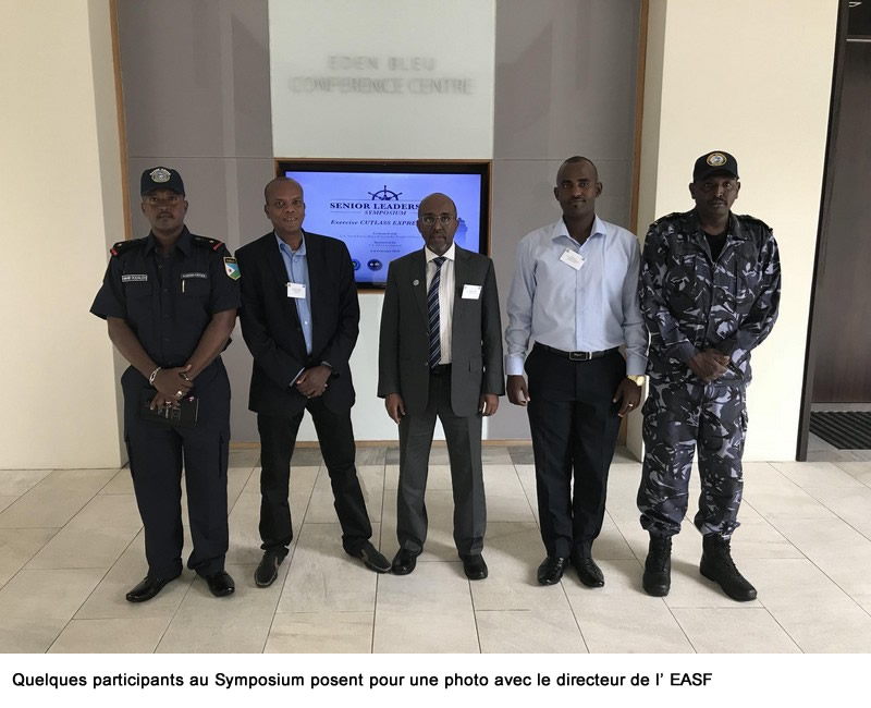 TL'équipe de la Force en Attente de l’Afrique Orientale (EASF) au Symposium était présidée par le Directeur, le Dr abdillahi Omar Bouh, accompagné par le chef de la cellule maritime, le colonel Saeed Khamees Saeed et conseiller technique maritime à l’EASF ainsi que, le CDR (SG) Lars Ivar Fjell. Le Colloque visait à promouvoir l'élaboration des stratégies maritimes nationales et des concepts opérationnels, y compris des capacités de leur mise en œuvre.