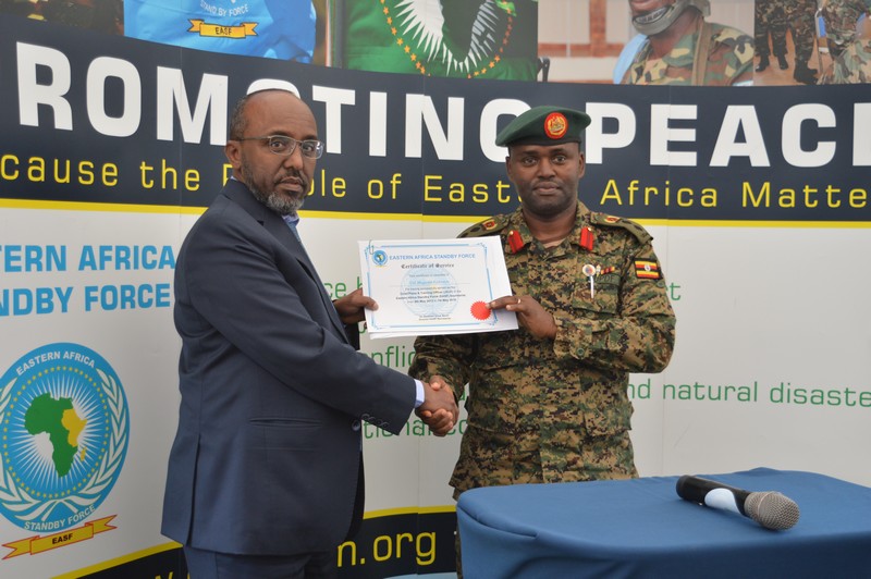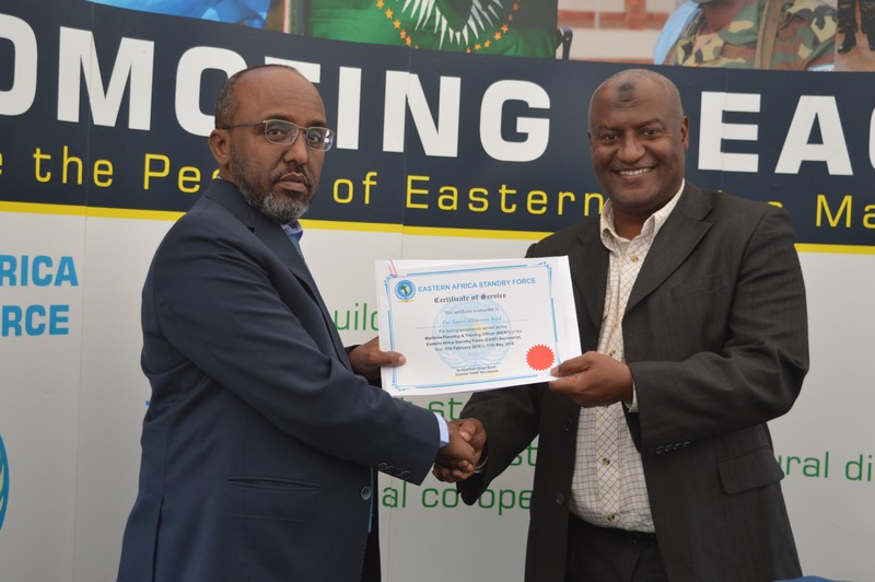 Au nom de toute la fraternité de l'EASF, le Directeur, Dr. Abdillahi Omar Bouh, a exprimé sa gratitude aux Etats Membres respectifs pour avoir mis à disposition des Officiers dévoués pour servir au Secrétariat. Parmi les autres contributions, les officiers ont joué un rôle clé dans l'organisation et la coordination des activités de l’élément de planification, y compris les formations aux opérations de soutien à la paix. Parmi les formations les plus mémorables, l'exercice multinational et multidimensionnel d'entraînement sur le terrain (FTX), mené avec succès en Novembre / Décembre 2017 en République du Soudan.